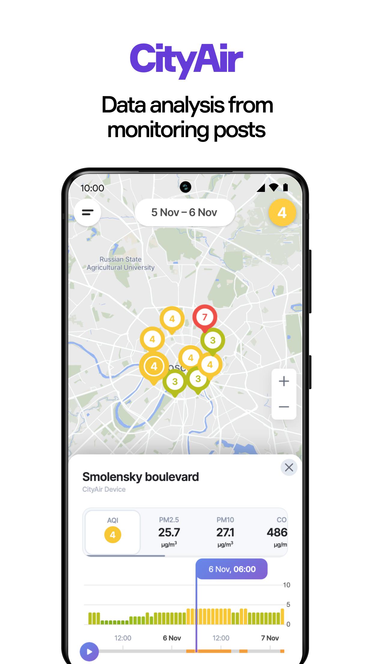 O aplicativo CityAir é uma área on -line pessoal para usuários profissionais envolvidos no monitoramento da qualidade do ar: especialistas em administrações municipais, ambientalistas, gerentes de empresas. O aplicativo fornece acesso à funcionalidade básica da plataforma CityAir , que agrega dados de várias fontes e permite configurar redes de monitoramento de qualidade do ar.